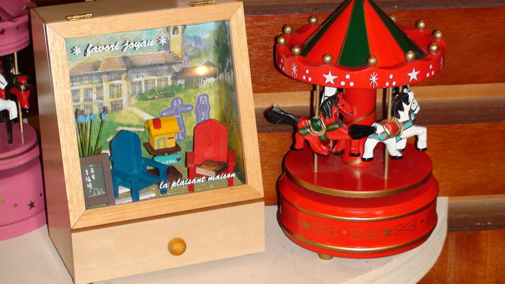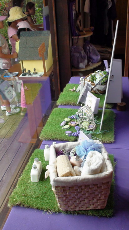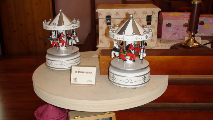 來看看木屋有什麼東西?是販賣部,商品有手工皂、沐浴用品、布娃娃和飾品,還有2間廁所,女廁非常夢幻,除了大面鏡子外,還有浴缸和書架,環繞著浪漫的氛圍,很多人都順便拍照,可是也影響到後面排隊等的人,所以我們就沒有拍照,免得讓別人不方便。浪漫的氣氛驅使我們買了一個白色Merry-go-round音樂盒。