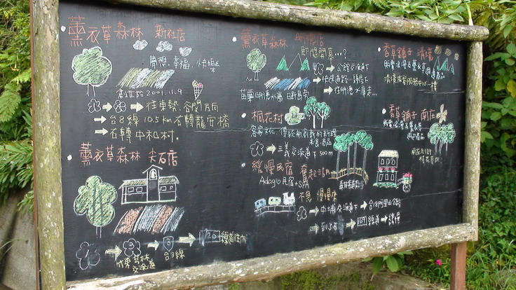 我們沿著指標行進,開始蜿蜒山路,起初路還算大條,但漸漸變小,只能單向通車,有些路段還有上次颱風的落石殘留,要小心前進,開了滿長一段時間,仍然看不見薰衣草森林的蹤影,我們心中疑雲四起時,竟然看到路標上寫著:『請千萬不要放棄,薰衣草森林就快要到了』,只好向前走,又開了一段路後,看到了工讀生弟弟在指揮,讓我們心情一振,以為即將抵達,結果,哈!又被騙了,又經過了幾個工讀生的指引區,才終於看見目的地。