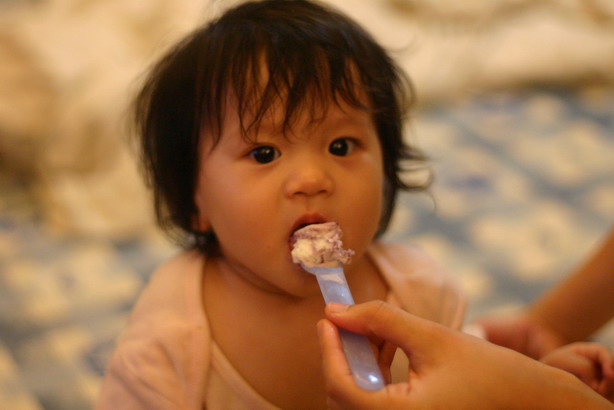 話說回來,媽媽怕我發飆,拿出了我沒見過的東西,要分散我想要起壞面的心情。咦?一坨不知道是什麼東西,不管3721我先吃吃看。