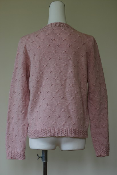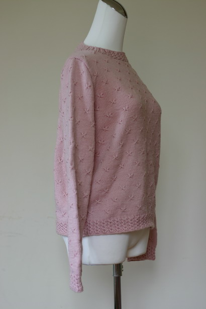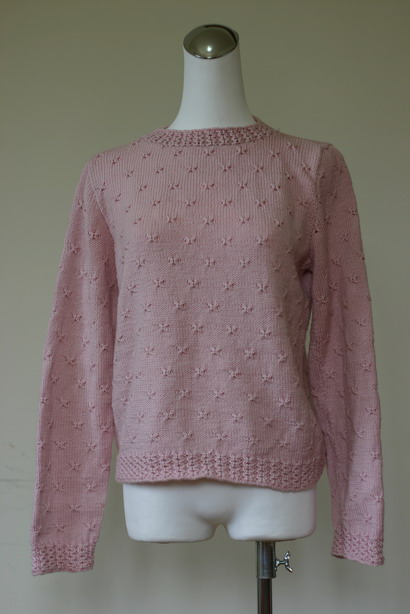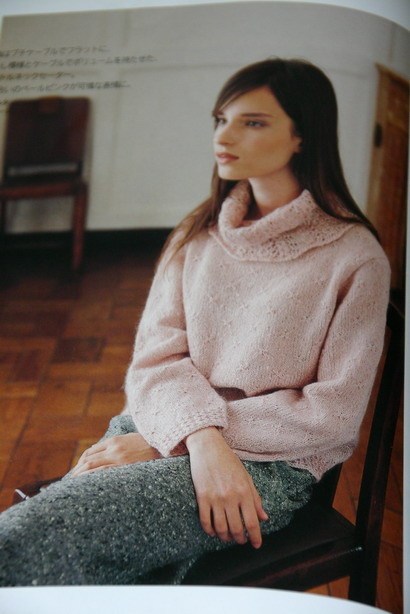 這次要獻醜的毛衣是自己織成的第一件套頭毛衣,書上的模樣本來是設計為高領,但我把它打成一般的領子,這件毛衣主要難度在領圍、下擺及手圍,比身片的主花樣要花時間。這件毛衣我也很愛,基本上自己完成的每件作品都是我的至寶,也希望能好好保存它們。