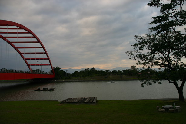 遊河船(此時天色已略顯暗淡,紅色大橋是遊河的終點,從這邊開始就要返航了。)