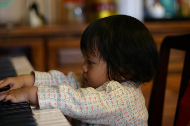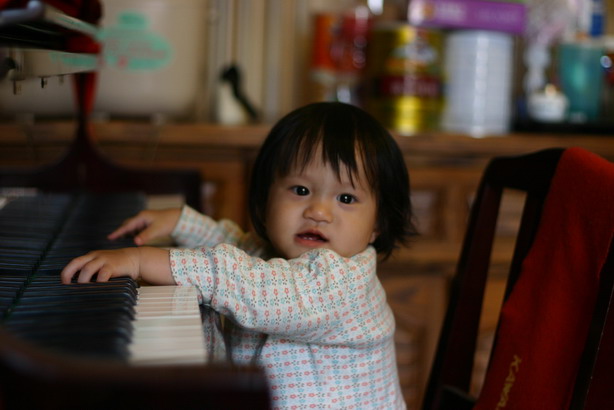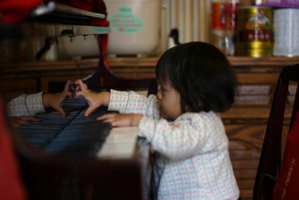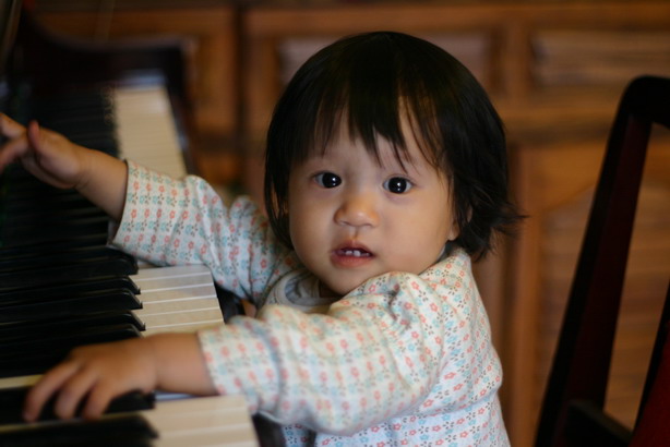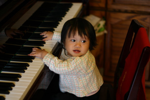 小嬡對於會發出聲音的東西特別感興趣,這天回到娘家,我心血來潮,讓小嬡玩玩我的鋼琴。把小嬡放上鋼琴椅,調整好高度,小嬡很好奇,用手從上往下拍琴鍵,發出了叮叮咚咚的音符。這台KAWAI鋼琴已經有25年歷史了,是媽媽小時候為我買的鋼琴,那時候要價10萬元,沒想到有一天我的女兒也能彈奏它。