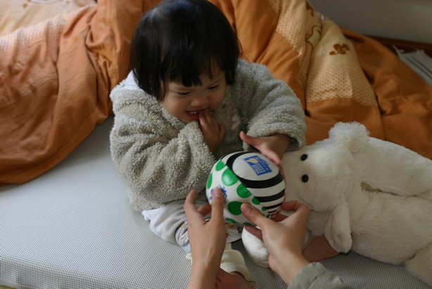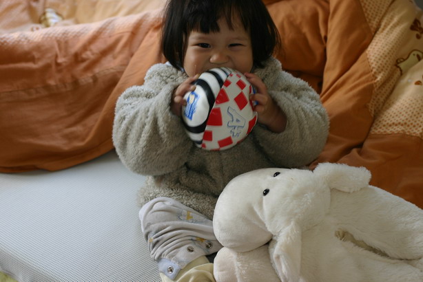 哎!是叫你丟球給媽媽,不是要妳拿來吃啦!