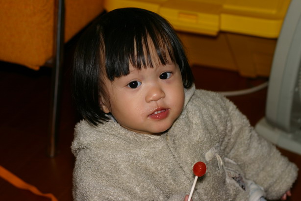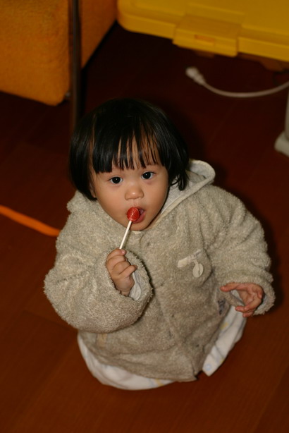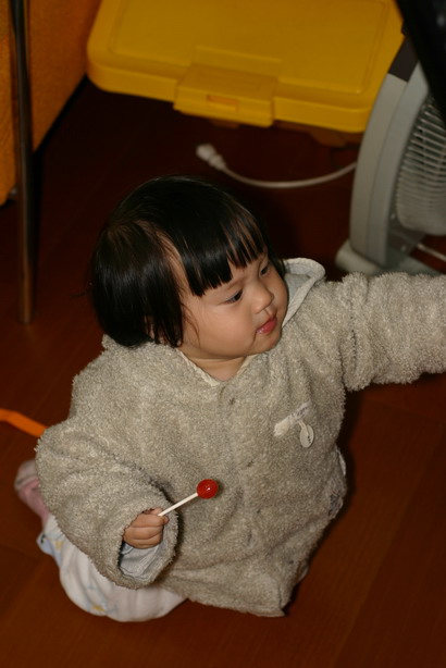 除了走路外,小嬡還愛上棒棒糖這迷人的東西,自從她好奇的舔了勳寶正在吃的棒棒糖後就愛上了這滋味,只要看到棒棒糖就會急切的尖叫,示意我們拿給她吃,一邊舔一邊流著口水,然後當然是心滿意足的吃光光。