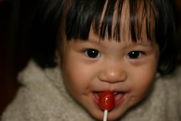 舔棒棒糖弄了一堆口水在臉上,吃完了還一臉捨不得,可是不能再吃了,會蛀牙。