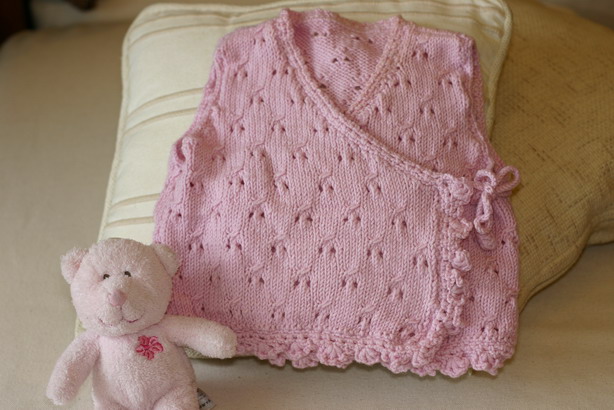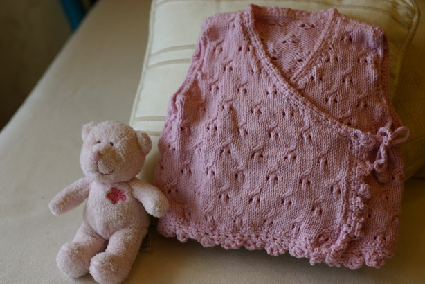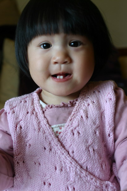 這件嬰兒背心是在小嬡未出生之前就準備好了。當小嬡在我肚子裡12週大時,得知她的性別後便著手編織這件背心來期待小嬡的誕生。不知道是不是小嬡天生喜歡粉紅色?懷小嬡時看到粉紅色心情就很快樂,會一直想買粉紅色的東西。我也喜歡粉紅色,但是懷孕那陣子真是有說不出的粉紅色喜愛度,生下小嬡後對粉紅色的感覺又回到正常的感覺,仍然喜歡但沒有那麼強烈的感覺了。在背心旁邊的mothercare粉紅小熊是小嬡出生後才買的,非常可愛,我們管它叫「熊熊」,是小嬡最喜歡的玩偶之一,就請熊熊一起和這件背心入鏡。