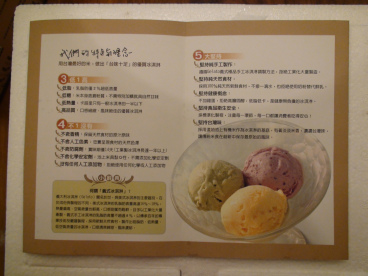 第二頁是多力米冰淇淋的理念與特色。店家的理念與特色是「3低1高」:低脂、低糖、低熱量、高品質和「4不1沒有」:無香精、人工色素、防腐劑、化學安定劑、人工添加物。還有5大堅持:純手工製作、純天然食材、不添加雞蛋、堅持食品衛生安全、堅持台灣味。