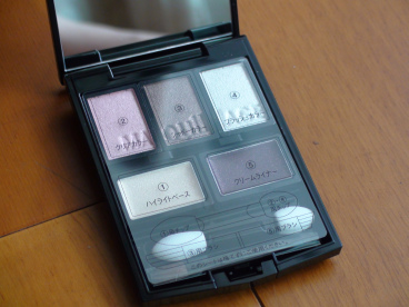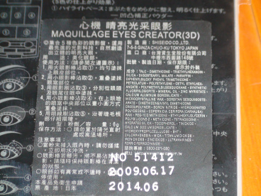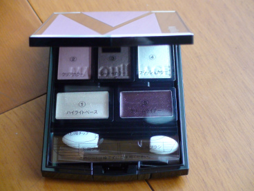 上面有個示意透明片,標明眼盤內的使用序號,由左下開始順時鐘方向依序1霜狀打底乳白色→2粉紅色→3咖啡色→4銀白色→5眼線膏,通通都帶有亮粉光澤。櫃姐說1號打在整個眼窩和眉骨下,2號打在整個眼窩,3號則由眼睛左邊和右邊向中間塗抹,中間形成一個凹型,將4號塗在凹型處,最後用內付的斜角眼線刷將5號上在眼週當做眼線。用法和前面的日文說明一樣。