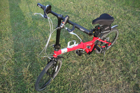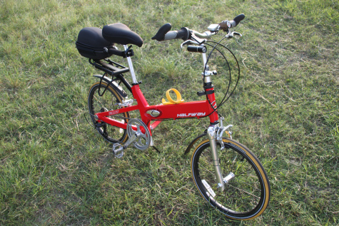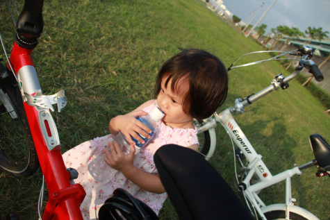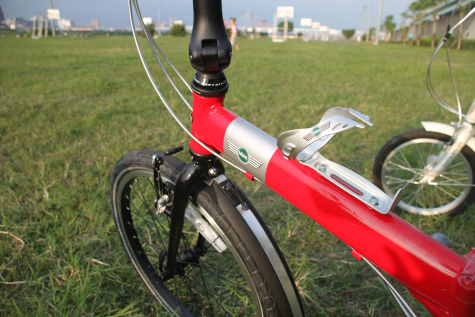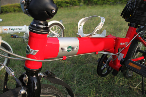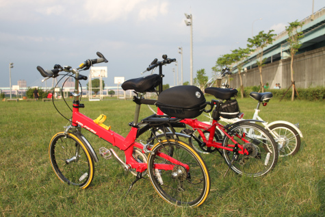 最近在老公不斷的勸說下與勳寶終於在暑假學會騎腳踏車後,我終於答應要買台小摺完成老公想要全家一起在假日時去騎單車的夢想(他高中時都騎單車上下學,很喜歡騎單車的感覺),尋覓了一陣子後,終於買到了一台老公認可且我也喜歡的小摺。這部小摺算是系出名門,是英國mini cooper授權台灣生產的小摺,我買的是20吋7段變速的鋁合金車款,車重約12kg,鋁合金全系列有16吋和20吋,16吋僅有6速,20吋則有7速和21速,我這款顏色共有四色,分別是黑、白、藍和紅,我毫不考慮的選擇紅色,年紀大了,對紅色有說不出的喜愛,更何況我覺得mini就是要配紅色才經典。我們看了許多牌子,有GIANT、美利達、WEMAX、DAHON和MINI COOPER,論外型我最喜歡MINI,但是對講究功能性的老公來說,考慮的重點就和我不同,最後選擇這台車子的原因,是這款車是採用DAHON的摺疊盒,老公非常喜歡DAHON,可惜他已經買了GIANT了,所以一直把希望放在我這台車上,當他得知MINI是採用DAHON的摺疊盒,就決定讓我買了。今年9月DAHON不再授權給MINI使用折疊盒,MINI只好另尋他方,因此當月的車款有新舊款之分,價格相同,舊款使用DAHON的摺疊盒配46輪盤,新款使用新的摺疊盒(老闆有介紹,我忘了)配52輪盤,其他不變。