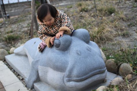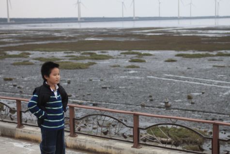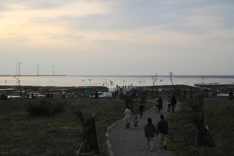 我們約下午四點到這邊,滿天彩霞已現,今日海面風平浪靜,遠看像一面鏡子,我倏然覺得這邊很美。勳寶一馬當先跑在前頭,我牽著小嬡慢慢行進。遊客滿多的,今日海風徐徐且綿密,吹出惱人頭痛,但許多人都無畏寒意赤著腳要感受踩踏濕地泥土的滋味。