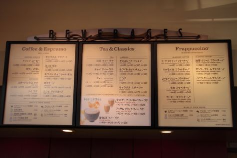 日本星巴克menu,它們的種類很多,至少非咖啡類飲品比台灣多很多,以現在的匯率來說整體價格也較台灣貴許多。以拿鐵和卡布基諾為例,小、中、大、特大,價格分別是¥320、370、420、470。摩卡分為白巧克力和黑巧克力,價格依容量,分別是¥380、430、480、530。自行攜帶杯具可享折扣¥20,台灣可折10元則比較優惠。