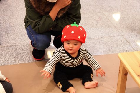 日本主婦帶著小baby來買東西,這個小朋友的帽子很特別。