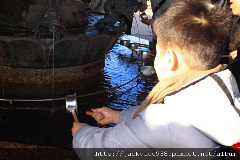 參拜前要淨手,勳寶率先示範。寒冬早晨用冷水洗手也是小考驗。