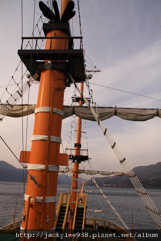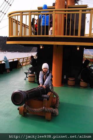 上船囉!天色已經不像中午那樣晴朗,開始暗下來了。船艙外風大吹得我頭疼,妹妹和我趕緊帶著小嬡和小沅宸躲入船艙內避風,照相的重責就交給老公和妹夫。勳寶戴的毛帽也是我的成品,駝羊毛線應該滿保暖的。