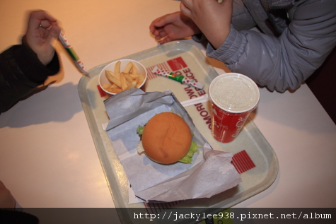 遊行結束後,妹妹一家和我們去吃點東西。看到漢堡時有些失望,本來以為它會是米奇形狀的麵包,竟然是普通不過的圓形,汽水、漢堡與薯條尺寸都很迷你。勳寶吃完後獨自一人再去玩「大賽車場」。