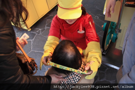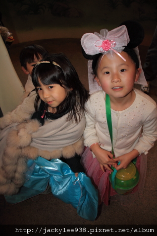 等勳寶回來後,我們去了早上先抽FP之「夢幻樂園」的「小熊維尼獵蜜記」。排隊時和兩位可愛的日本小女生聊聊天,看看她們的穿著多麼配合迪士尼的奇幻氣氛。進入遊戲區內是不能拍照的,我們一家四口搭乘一個咖啡杯,隨著音樂旋轉參與小熊維尼的採蜜過程,小朋友們都很陶醉。