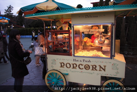 園區內每個主題區都有爆米花攤,搭配不同的卡通主題,這個就是小熊維尼的蜂蜜口味爆米花,蜂蜜味滿香濃的,隨著冬風瀰漫各處。