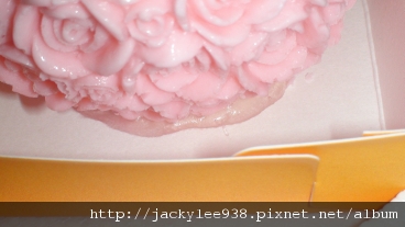 這個蛋糕真的滿美的,我在為我的部落格拍照時,老公也拿出他的500D來照相,彷彿這個蛋糕只是為了讓我們拿來照相的物品。拍照結束準備拿來吃時,老公還問我真的捨得一刀切下去嗎?切開後的切面就是玫瑰花體加上草莓口味的冰淇淋,玫瑰花體吃起來有點像粉粉的紅豆糕,說實在的,我覺得很難吃,草莓冰淇淋的草莓味淡到我問老公是什麼口味的冰淇淋,這整個蛋糕對我來說真是「只可照相,不可入口」啊!