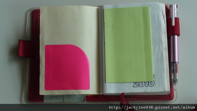 手帳的第一頁左邊黏上的是不實用的口袋,所以我沒拿來放東西。右邊是3M的狠黏Post-it,可以做些筆記延伸一下紙張空間。