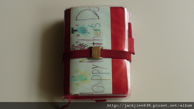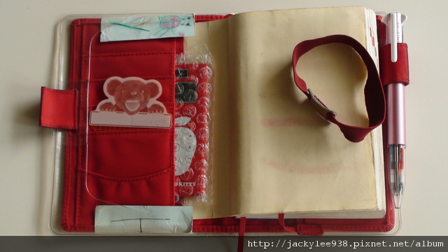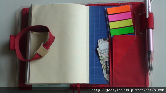 目前的手帳外皮模樣,套上Mark's的紅色綁帶,算是滿有默契的搭配。綁帶是去年在誠品敦南文具館買的,價錢忘了。