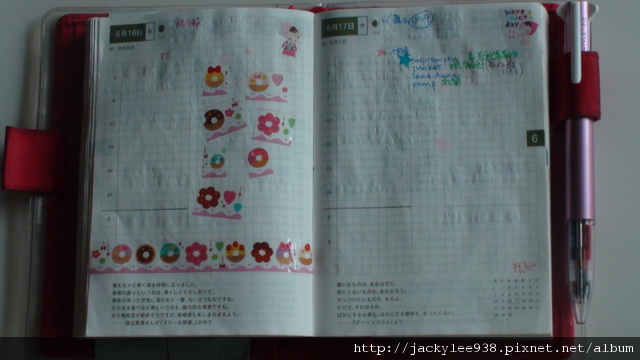左邊頁面貼的是我在大創買的甜甜圈膠帶,本來想學別人做紙膠帶貼紙,沒想到買錯了(它是塑膠材質的),先收起來,以後看有沒有別的地方可以派上用場。