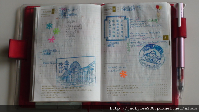 參觀台灣博物館的紀念。頁面上的貼紙是我用打洞器去打螢光貼的實驗品,效果不甚理想。