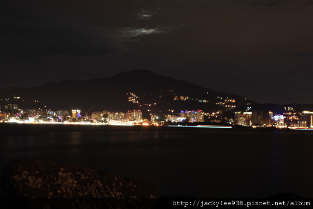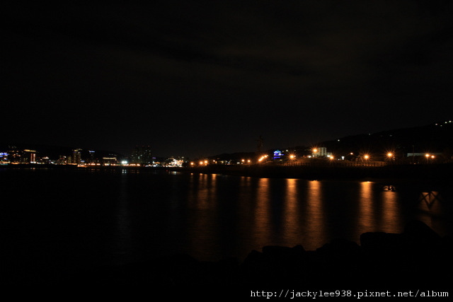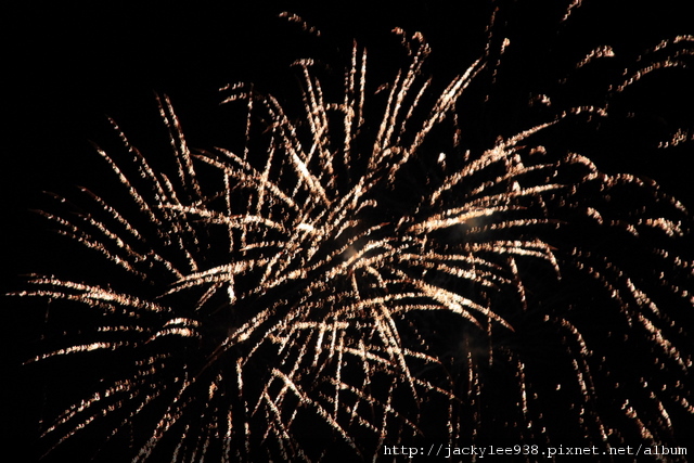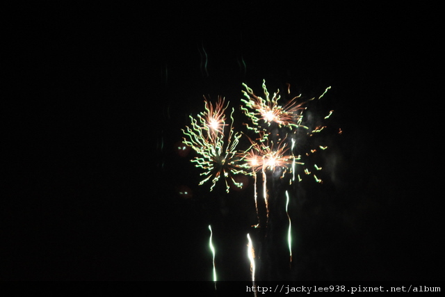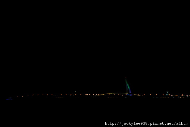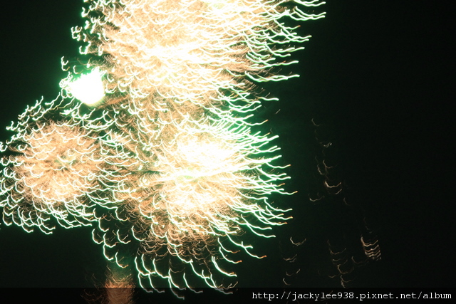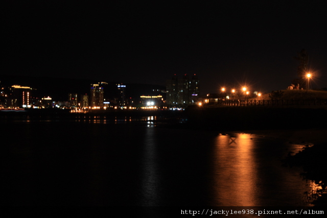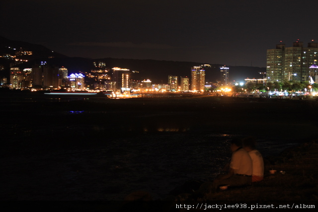 昨天晚上我提議全家到八里看夜景吧!7點35分出門,不到8點我們就停妥車開始散步了。沒料到突然聽到砰砰聲,大家的目光都循著聲音的來源望去。啊!原來是有人在放煙火,今天的夜空滿乾淨的,煙火一發發不停的在黑夜中噴發灑落,浪漫且絢爛,現場所有的人都屏息欣賞這意外的美麗時刻。很快的,剎那的奪目眩光就在大家的讚嘆中悄然結束,老公連腳架都還沒準備好,直扼腕。