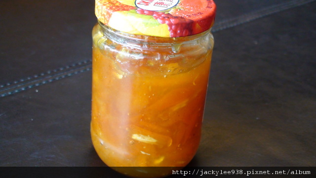 昨天開始著手製作,先把金桔洗乾淨,去籽切片,放在鍋內,一層金桔一層冰糖,放到鍋內8分滿後,靜置15分鐘,讓金桔出水。然後就可以開始用中火一邊煮,要不時攪拌,煮開之後,轉小火再翻攪,以免燒焦。煮到湯汁變濃稠,即可裝瓶。瓶子要洗淨並吹乾,才能使用。裝瓶後蓋上瓶蓋倒置,這樣會產生真空效果。放涼後就可以拿到冰箱冷藏,聽說可保存1年。作法看似簡單,去籽就累死我了,光切金桔就讓手指起水泡,更別說還要站在爐邊攪拌,再挑出漏未挑到的籽,大概要煮30~40分鐘,累煞人了。講到瓶子,之前都拿去回收了,臨時需要瓶子,只好把冰箱中的瓶罐拿出來整理,還去娘家拿了幾個,這樣才夠用。