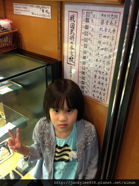 中學生未滿的勳寶又是免票入內,天守閣有8層樓高,先搭電梯到7樓看豐臣秀吉的一生,走上8樓瞭望台,再下到5樓和4樓看豐臣秀吉的文物展示(這2層禁止拍照),裡面太暗,所以就沒多拍照了。勳寶在頂樓買了把神龍刀(300/個)鑰匙圈作紀念。