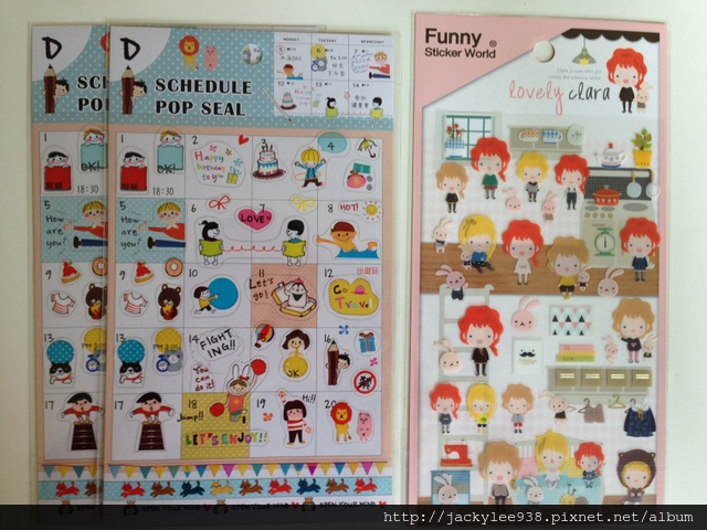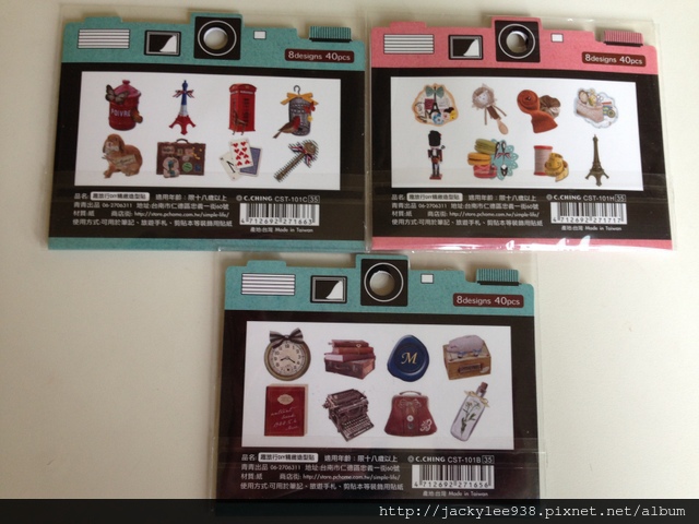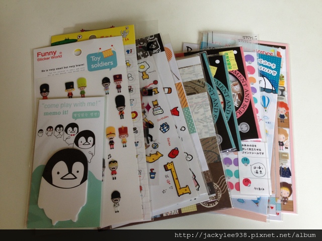 一直以為自己沒那麼愛買貼紙,從小我們家愛買貼紙的是妹妹,印象中她有很多貼紙簿,貼些什麼早已不復記憶了。我小時候喜歡的是集卡冊,就是那個一包5塊錢,裡面有幾張卡,把收集到的卡片貼在集卡冊上,如果買到的卡包內有重複的就會跟同學交換,若一直買到重複的就會很沮喪。喔!好像離題了,難道這是初老的通病,趕快回到主角貼紙來。今天心血來潮看了一下放貼紙的抽屜,不得了了,居然也不少,默默就有一大疊。