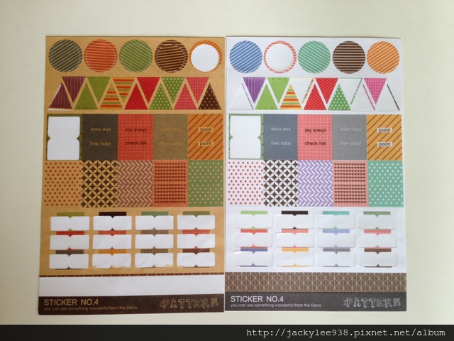 左邊是光南買的,入手一陣子了,沒什麼在用。右邊這兩張是學校附近唯一的文具店買的,粉色部分是亮面的,主題不錯,但品質待加強,不是很好撕,有時連底紙都會一起拔出來。