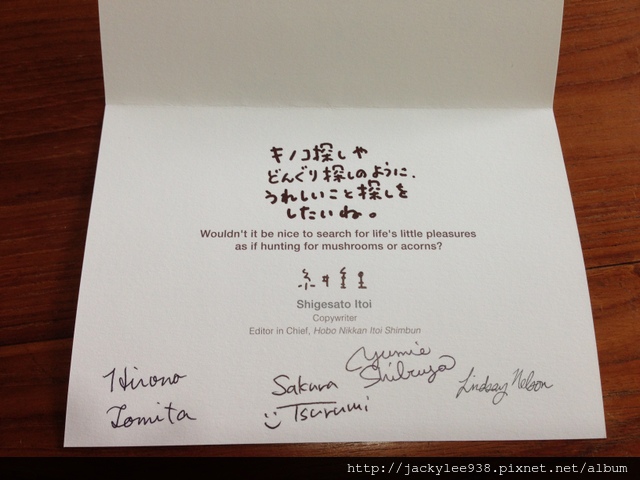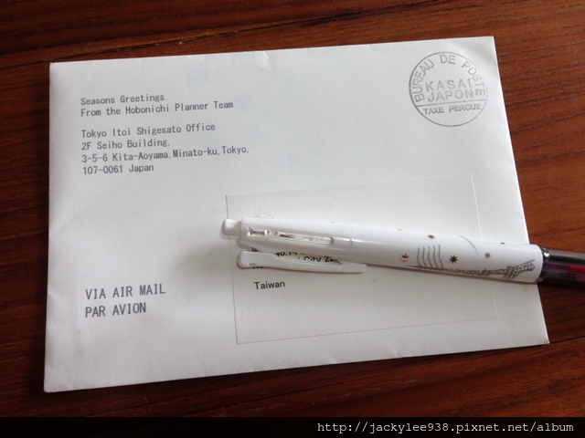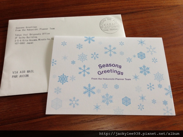 週六晚上援例到婆婆家吃晚飯,發現客廳桌上躺封卡片,封面除了我的姓名是中文外,其餘是英文,看了寄件國家是日本,我猜一定是跟1101手帳有關。