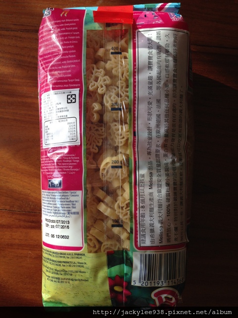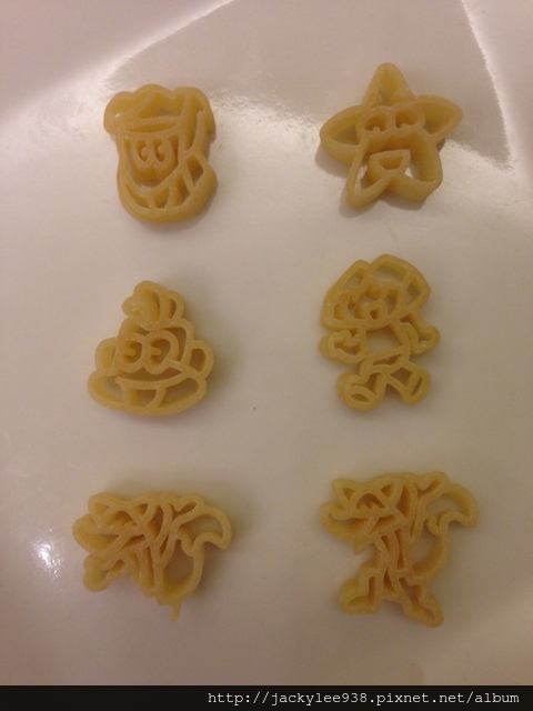 上周六晚上去某間專賣烘培食材器具的店買東西,老公看到特殊形狀的義大利麵,有Dora、Cars和海綿寶寶,老公說要買Dora給小嬡,讓她開心。